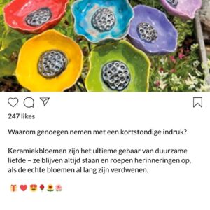 Wil je zeker zijn van jouw favoriet? Stuur ons een bericht via info@keramiekbloemist.nl, dan houden we er graag eentje voor je apart.Dank voor je geduld en enthousiasme voor onze unieke keramische bloemen! 🌸✨
