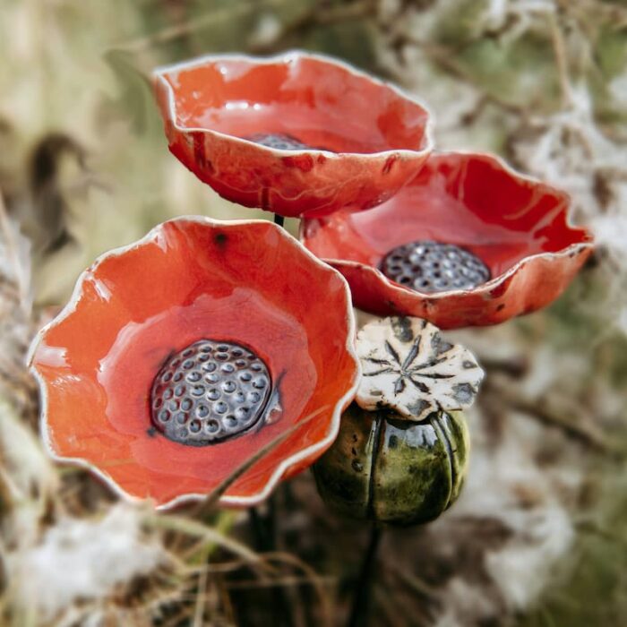 Dit is echt een waanzinnig mooie eyecatcher in je tuin! Een set van 3 grote rode klaprozen en 1 papaverbol van keramiek. Gebaseerd op de Papaver Rhoeas, een grote enkelbloemige rode papaversoort. Handgemaakt, hierdoor is iedere klaproos onderling iets afwijkend.